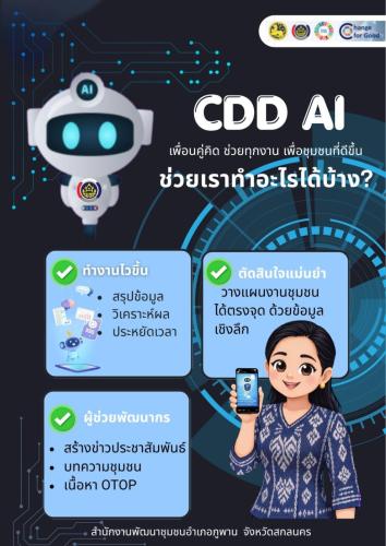 CDD AI เปรียบเสมือนผู้ช่วยอัจฉริยะ ช่วยวิเคราะห์ปัญหาความยากจน สนับสนุนการสร้างรายได้ พัฒนาสินค้า OTOP ส่งเสริมการตลาดออนไลน์ และการท่องเที่ยวชุมชน พร้อมรวบรวมข้อมูลสำคัญในรูปแบบ Big Data เพื่อช่วยวางแผนและตัดสินใจได้อย่างมีประสิทธิภาพ